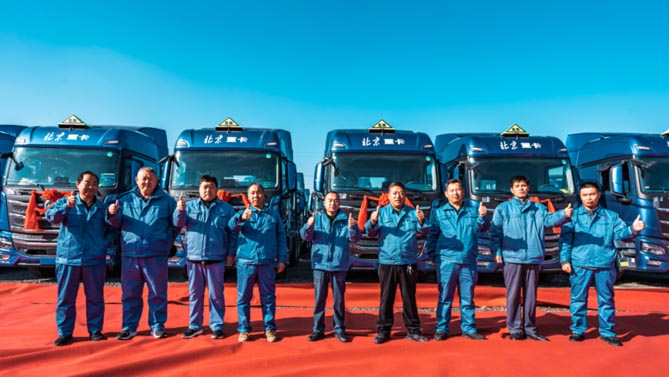 11月16日,山东淄博。在淄博市物流与供应链协会、行业客户代表等共同见证下,80台北京重卡危化品牵引车顺利交付山东淄博大客户。