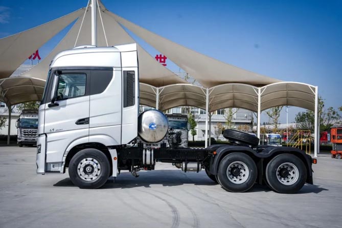 整车采用轻量化铝合金轮圈、少片簧悬挂、一体化气瓶支架、轻量化气瓶,合理降重可达259公斤,整备质量低至8.6吨,车辆空载时仍具备更低的气耗表现。