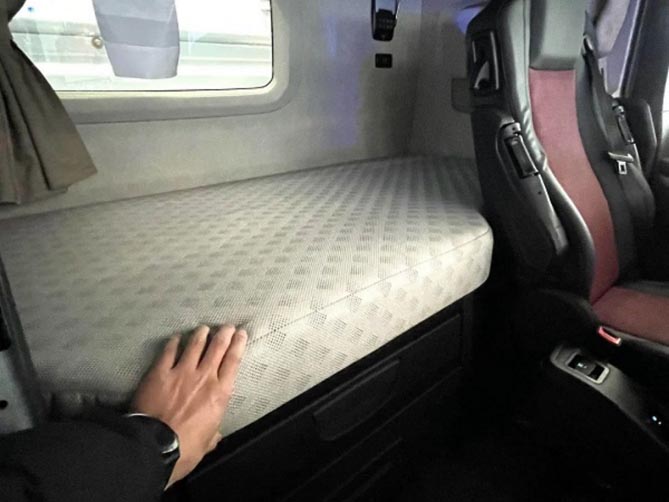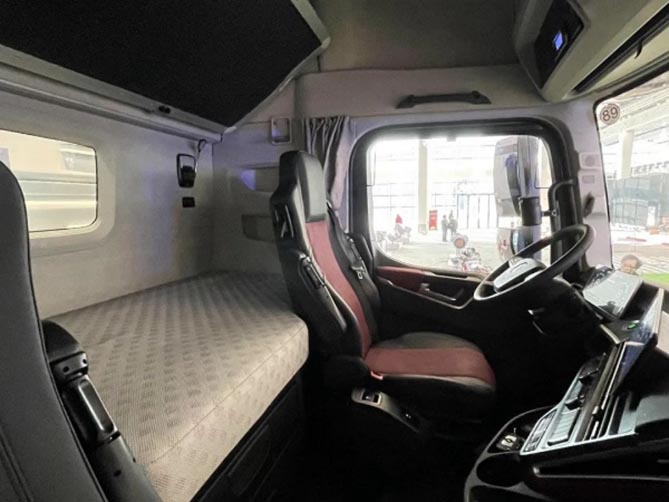 舒适性方面,延安重卡S700配有带通风加热功能的气囊座椅。长途运输不少卡友经常需要住在车上,延安重卡S700卧铺宽度和厚度都是非常不错的。带有柴暖,标配重卡专用锂电,配合变频顶置空调,让你睡觉吹空调不再焦虑。2500W大功率逆变器更可以充分满足用电需求,此外还可选装冰箱和饮水机。
