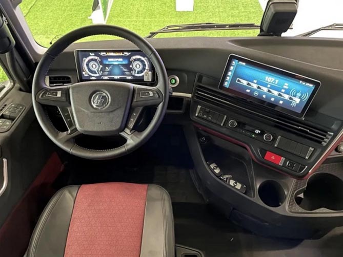 拉开延安重卡S700的车门,你会发现这款车配有无钥匙进入功能。纯平地板的驾驶室没有任何凸起,这使得驾驶室内高达到了2.13米,空间非常宽裕,全车具有超过1000L的储物空间。内饰造型风格非常年轻化。12.3寸液晶仪表和大屏也是目前主流高端重卡的配置。诸如一键启动、自动大灯、自动雨刮、自动空调都是标配。实拍车型还都配备了电子手刹。