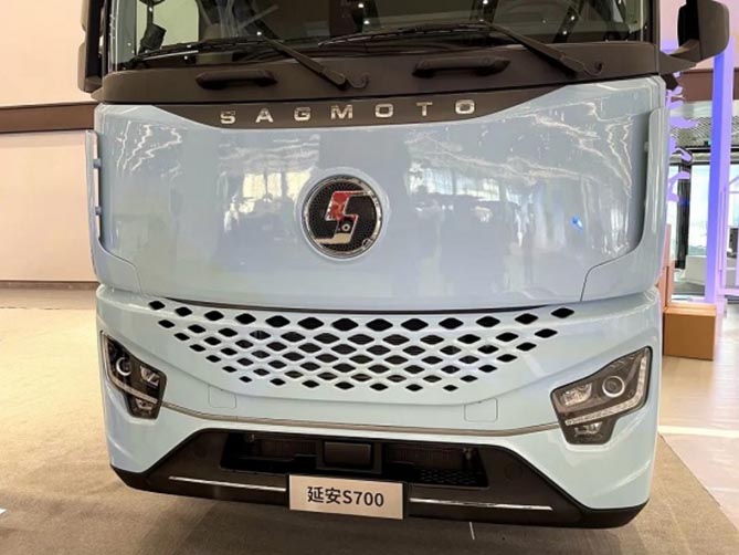 延安重卡S700涂装主要有延安红、星月蓝、冰川白等颜色。配有整体式低风阻前面罩和参数化仿生保险杠,中间带有会发光的品牌LOGO。低风阻设计的整车外观配合无级可调的顶部导流罩,使整车风阻表现优秀,这有助于长途高效运输的燃油经济性。