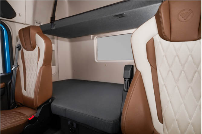 欧曼银河5驾驶室的通过尺寸达到了645mm、内宽达到了2237mm,高达到了1880mm,为驾乘者营造出开阔自由的驾驶环境,这种设计消除了传统重卡驾驶舱的局促感,更在视觉上给人以宽敞明亮的感觉,满足用户对重卡内饰空间和舒适度的需求。除此之外,一体式顶柜储物空间不仅美观简约、更实用便捷。它方便司机存放生活用品和工具等物品,让驾驶室更加整洁有序。