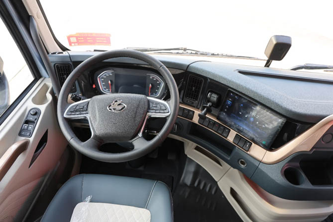 在外观上,乘龙H7 Pro 560 LNG牵引车紧跟潮流,全新设计的“聚宝盆”式前脸,大气美观,寓意财源滚滚来。仪表台时尚套色,带来愉悦视觉享受。整车采用2.5米宽体驾驶室,内高1.93米,搭配110公分宽卧铺,全车还有超800L储物空间,舒适性超越高级轿车。可谓精致的“一室一厅”。此外还配置了皮质高端座椅和皮质多功能方向盘,提升驾驶舒适感。7寸彩色组合仪表和7寸MP5丰富旅途享受,自动空调保持四季舒适。