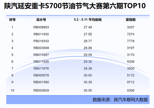 天行健系统记录的数据更直观展现了他的参赛轨迹:第二期的27.46升/百公里、第三期的27.83升/百公里、第六期27.48升/百公里。这稳定且优秀的油耗表现,既彰显了王师傅炉火纯青的驾驶技术,也印证了陕汽延安重卡S700在节能性能上的过人之处。