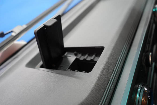 车内出风口均采用了飞机涡轮风扇引擎的样式,高端、精致,出风口外侧还采用蓝色饰条包裹。