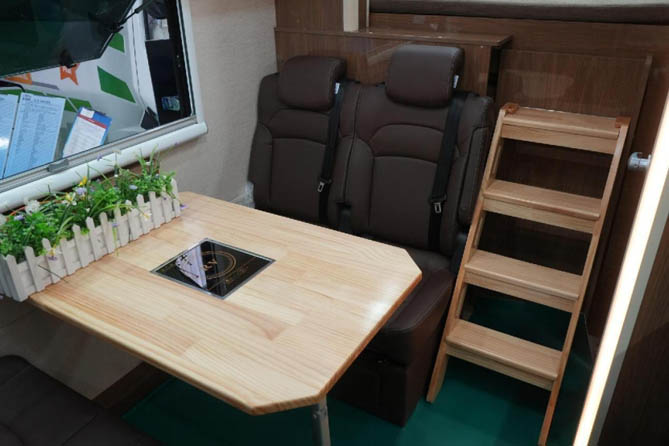 根据配置不同,车辆内饰配置也有着较大的变化。实拍配置为最顶配的旗舰版,配备了室内集成式燃气灶、集成洗碗机、多功能调料架、超大水槽、抽拉水龙头等配置。虽然是一台房车,但依旧带来了家一般的温馨体验。